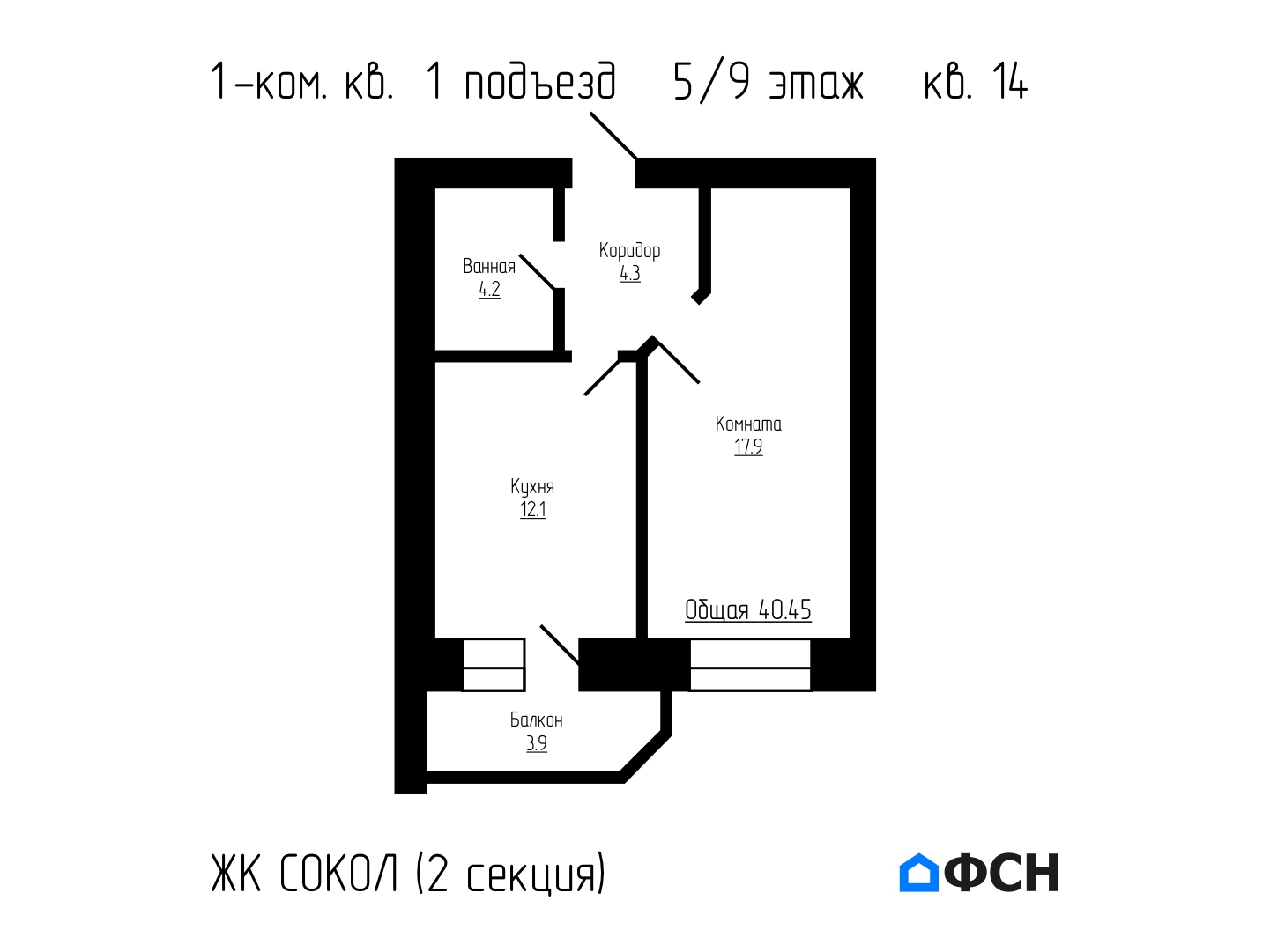 Продается 1-комнатная квартира 40,45 м² на 5 этаже 9 этажного дома комфорт класса – 2 секция 1 подъезд, квартира № 14