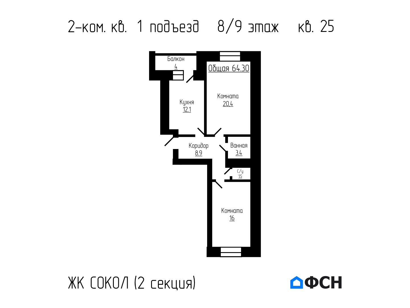 Продается 2-комнатная квартира 64,3 м² на 8 этаже 9 этажного дома комфорт класса – 2 секция 1 подъезд, квартира № 25