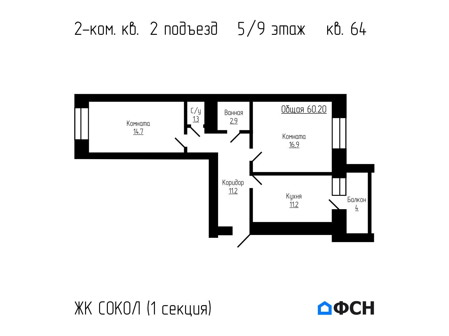 Продается 2-комнатная квартира 60,2 м² на 5 этаже 9 этажного дома комфорт класса – 1 секция 2 подъезд, квартира № 64