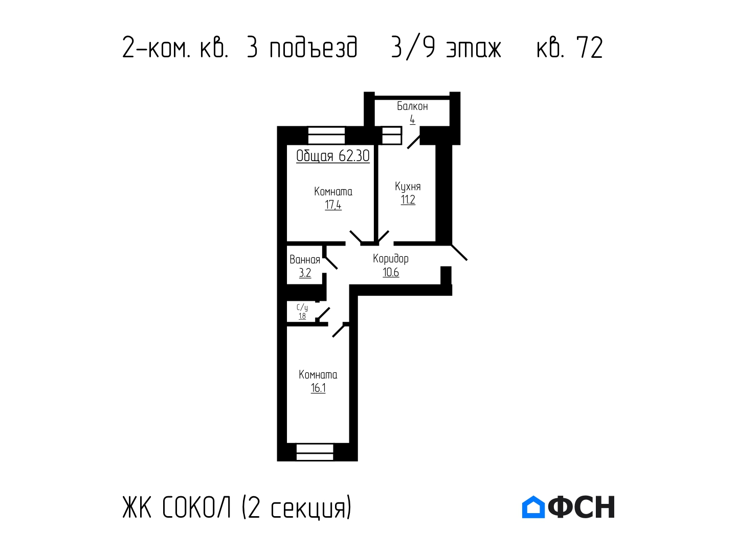 Продается 2-комнатная квартира 62,3 м² на 3 этаже 9 этажного дома комфорт класса – 2 секция 3 подъезд, квартира № 72
